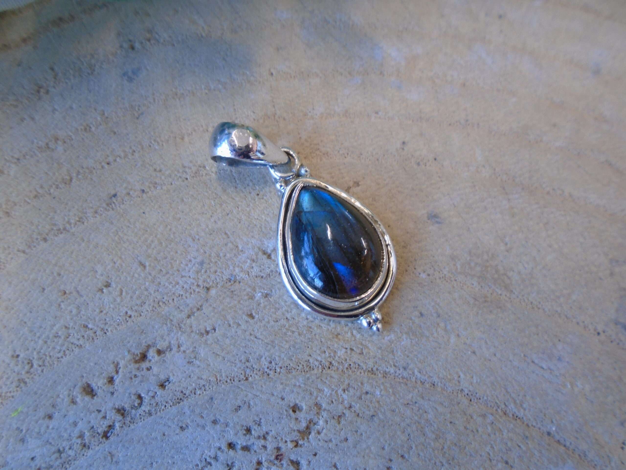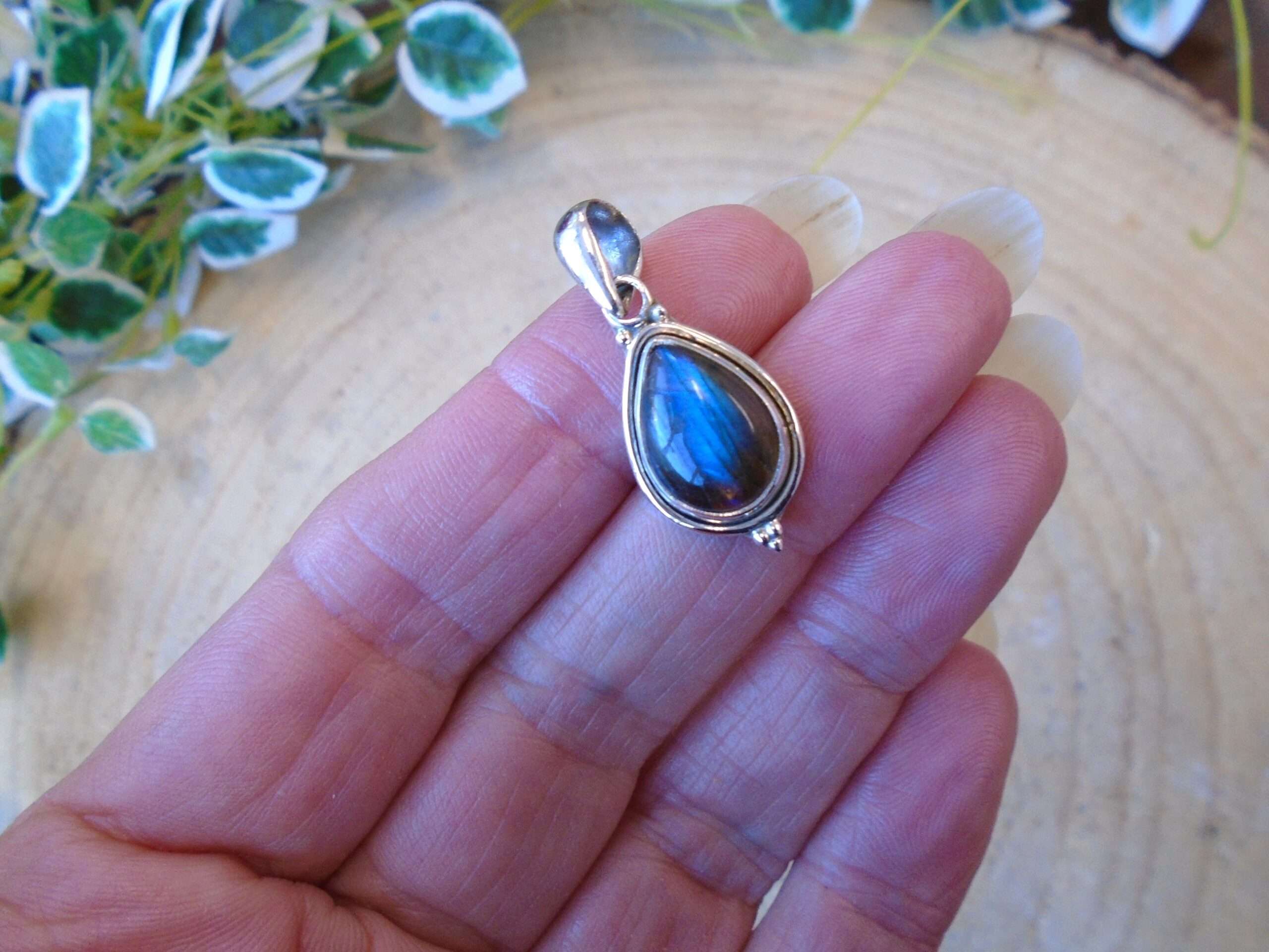 Pretty Labradorite set in 925 silver. This measures approx 3cm from the top of the loop to the bottom of the pendant x 1.5cm. It weighs 2.82g