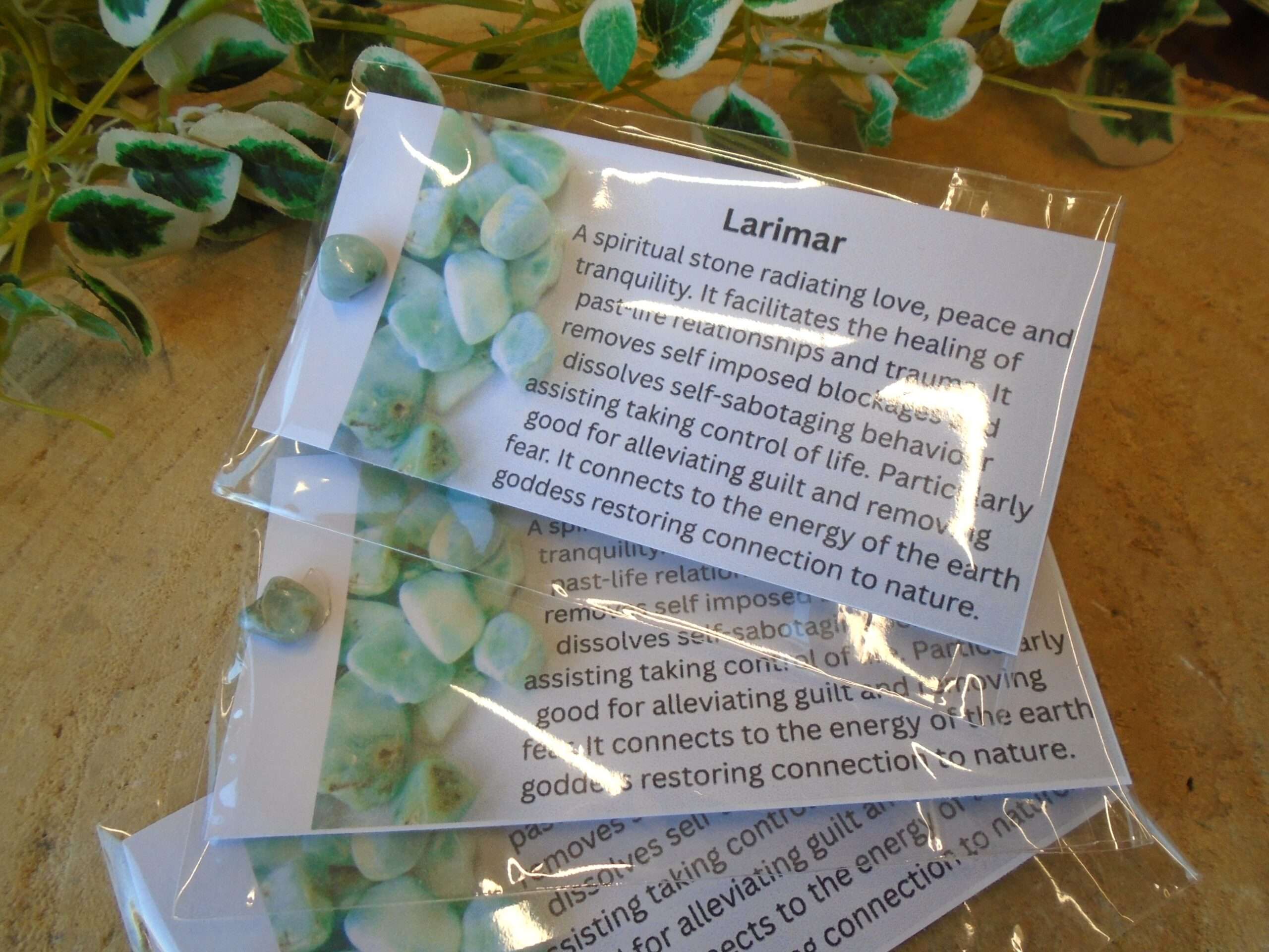 Price is per pack. Small piece of Larimar with information card. The card measures approx 10.5cm x 5cm and the stones are between 5mm and 10mm.